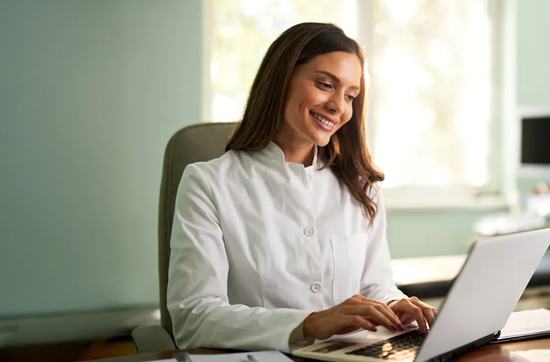 Smiling woman in a white coat using a laptop